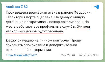 "Близько 02:30 26 грудня тактична авіація Повітряних сил атакувала крилатими ракетами великий десантний корабель Чорноморського флоту РФ "Новочеркаськ" у Феодосії", - йдеться в ранковому зведенні ЗС.