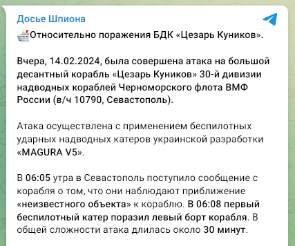 Як раніше писалось, 14.02.2024 Сили оборони України атакували надводними дронами ВДК "Цезар Куніков" поблизу м. Алупка, Крим. Внаслідок удару 5 безекіпажними човнами-камікадзе, корабель отримав серйозні ушкодження і затонув. Це офіційно підтвердили ряд українських високопосадовців, в т.ч. і голова ГУР К. Буданов.
