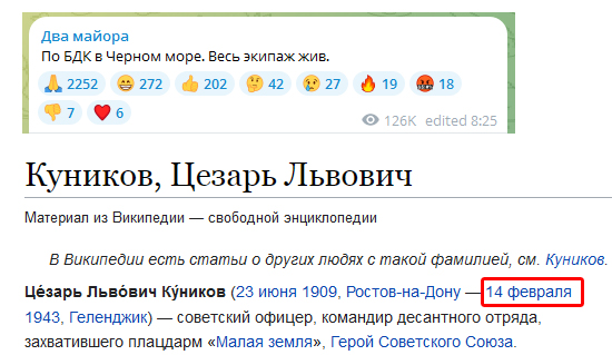 14 февраля 2024 г. Главное управление разведки (ГУР) во взаимодействии со всеми составляющими Сил безопасности и обороны Украины уничтожили большой десантный корабль (БДК) "Цезарь Куников" Черноморского флота РФ. Успешную миссию осуществили спецназовцы "Группы 13" ГУР МО Украины.