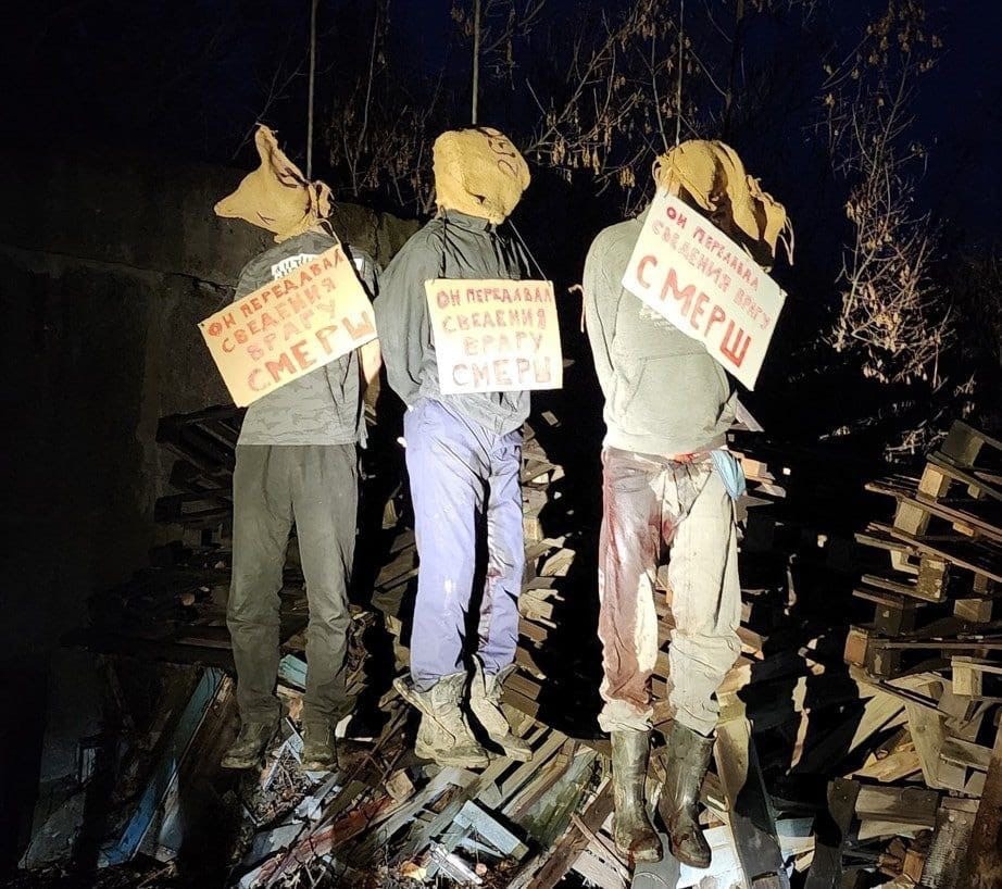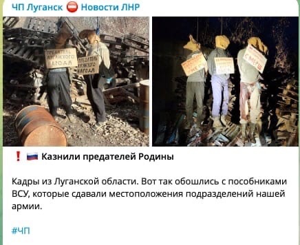В российских публикациях появились фото публичной казни гражданских в Луганской области. Их обвинили в "сотрудничестве с Украиной".