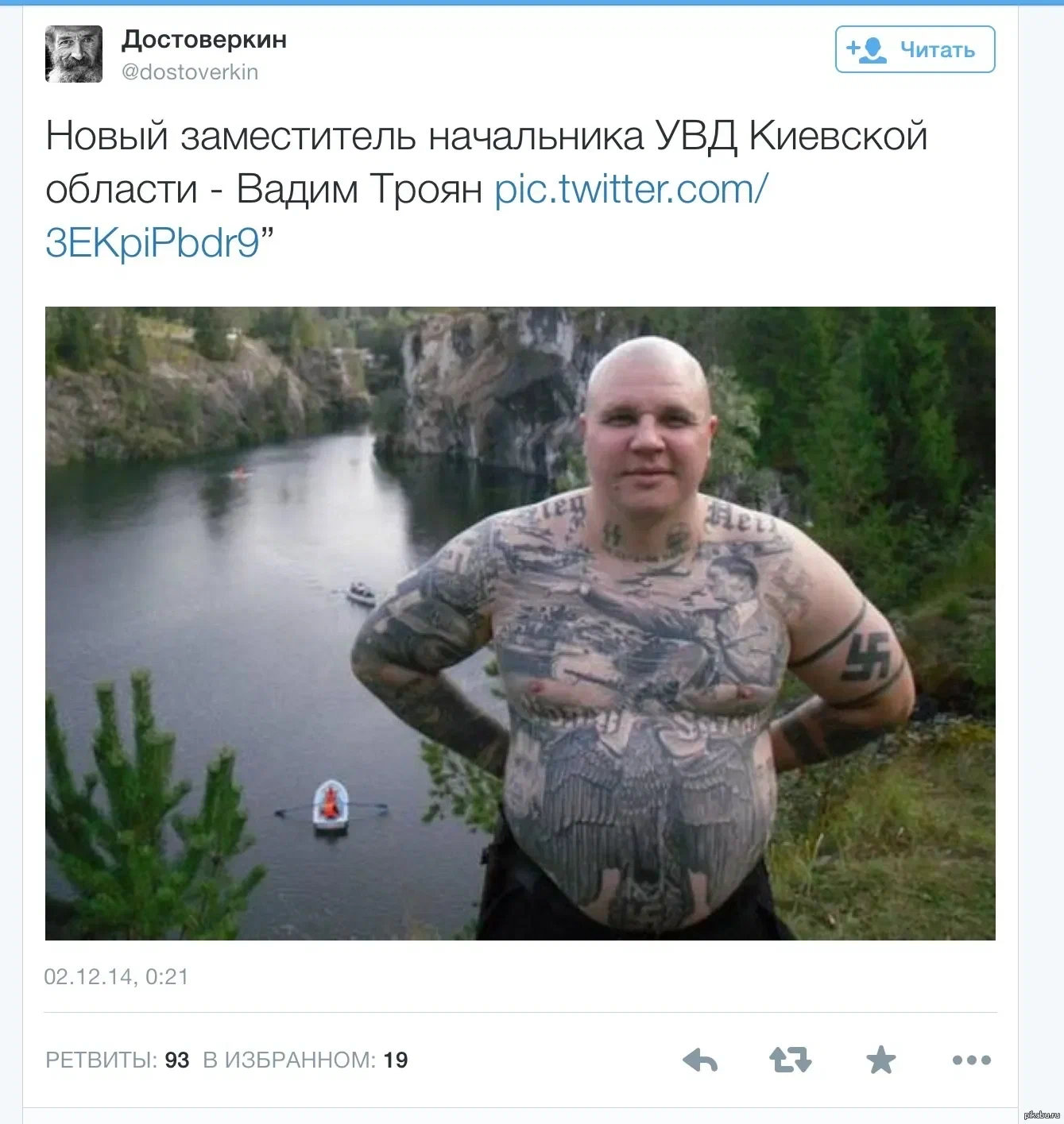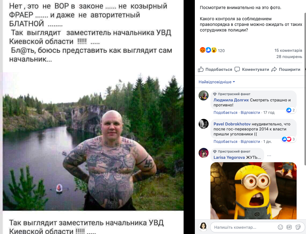 В 2014 году кремлевские пропагандисты в социальных сетях распространяли это и подобные ему сообщения, мол: "смотрите до чего докатились "майданутые" - заместителем начальника киевского главка МВД назначили приверженца и последователя нацизма! Если уж начальство милиции растатуированные свастикой скинхеды, то чего уж ожидать от личного состава должностями ниже?!"