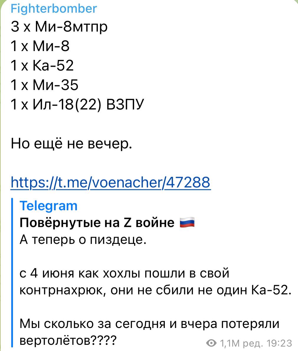 ВС РФ предприняли несколько попыток обстрела колон техники Вагнера с вертолетов и артиллерии, в результате чего вагнеровцы открыли ответный огонь и уничтожили три вертолета ВКС РФ, а позже самолет ИЛ -18