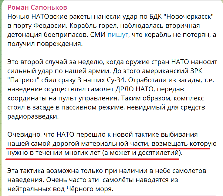 Т.зв. "голова Криму" Аксьонов і його підручні поспішили зазначити, що корабель лише "зазнав пошкоджень", а два винищувачі ЗСУ, які випустили ракети, нібито були успішно вражені силами ППО РФ: