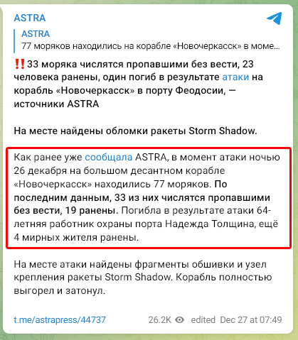 "Близько 02:30 26 грудня тактична авіація Повітряних сил атакувала крилатими ракетами великий десантний корабель Чорноморського флоту РФ "Новочеркаськ" у Феодосії", - йдеться в ранковому зведенні ЗС.