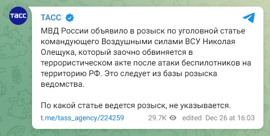 МВС Росії оголосило в розшук за кримінальною статтею командувача Повітряних сил ЗСУ Миколу Олещука, який заочно звинувачується в терористичному акті після атаки безпілотників на територію РФ. Це випливає з бази розшуку відомства. За якою статтею ведеться розшук, не вказується.