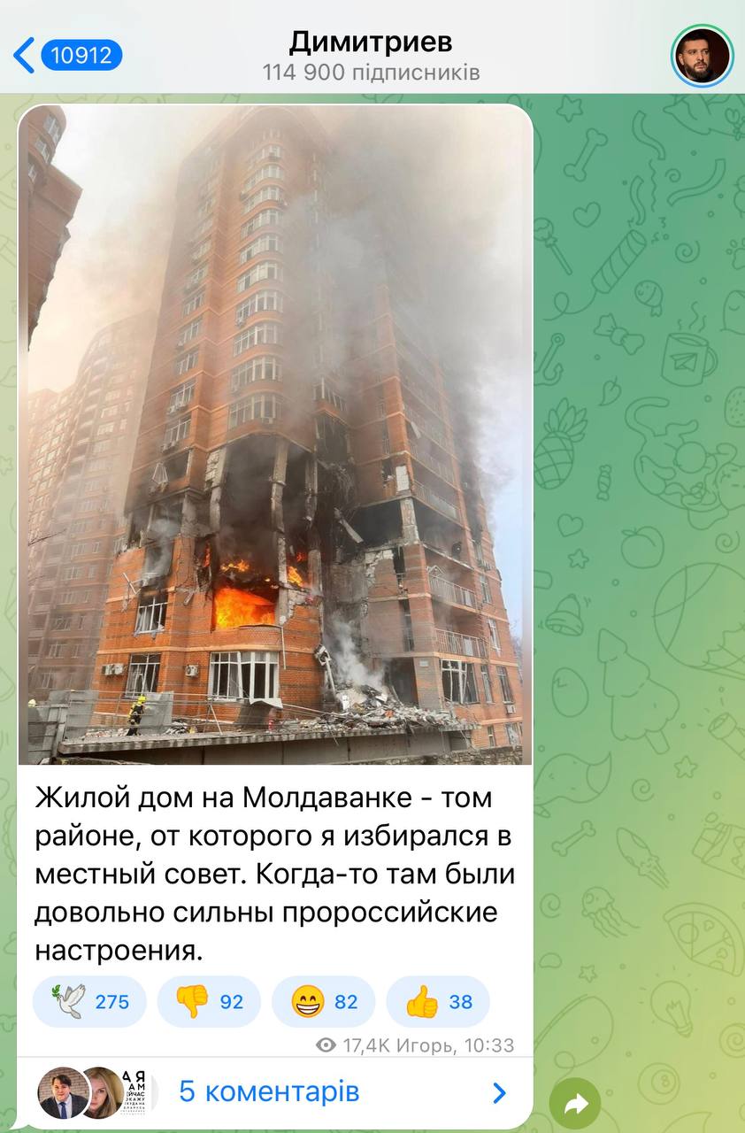Колишній депутат Одеської міськради від проросійської партії «Родина» Ігор Димитрієв написав, що Росія вдарила ракетами по житловому будинку у тому окрузі, де він раніше обирався до міськради. І де раніше були сильні проросійські настрої.