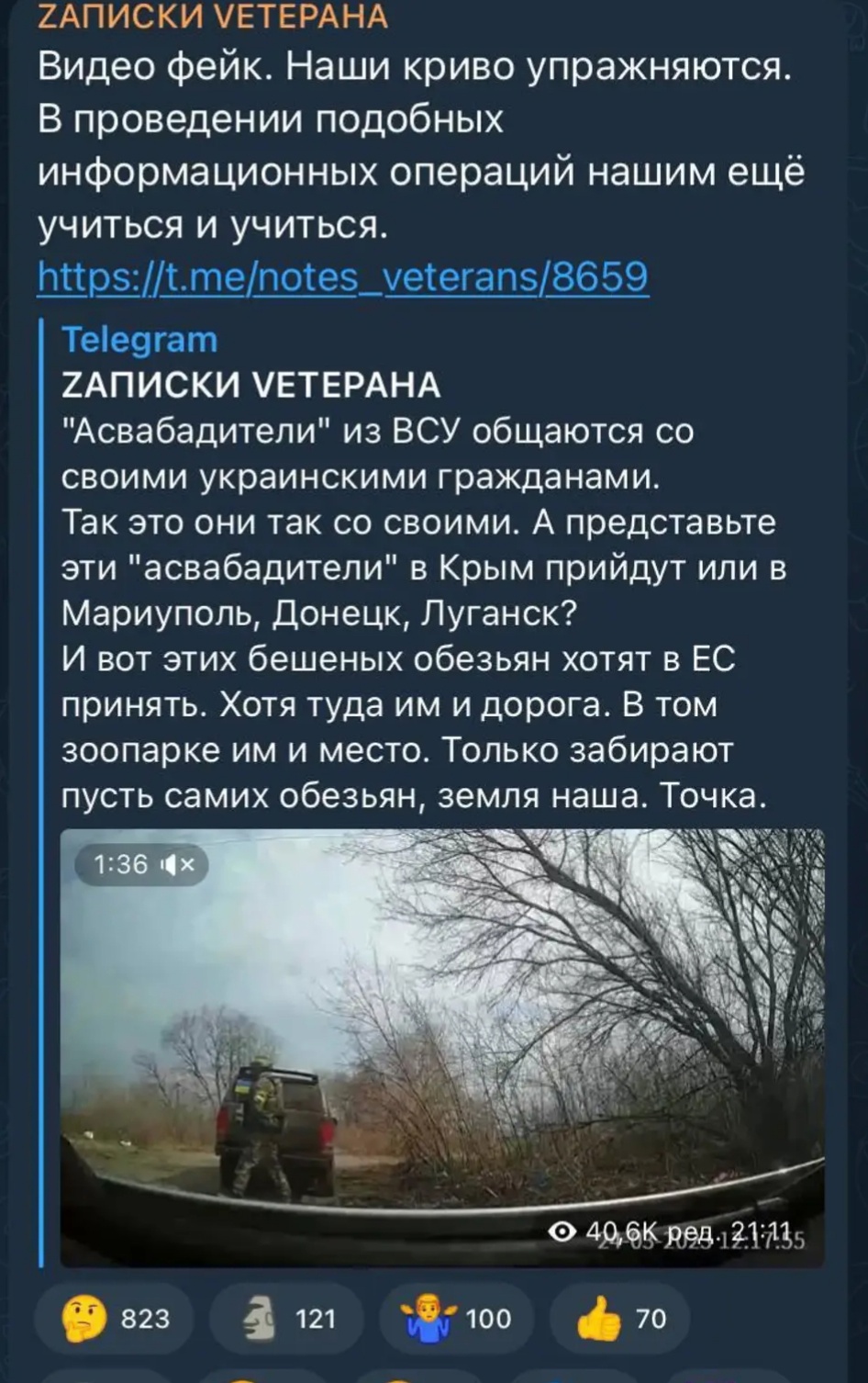 Телеграм-канал «ZАПИСКИ VЕТЕРАНА» (понад 300 тисяч передплатників) також визнав, що відео — це фейк, у якому «наші криво вправляються». «У проведенні подібних інформаційних операцій нашим ще вчитися та вчитись», — робить висновок автор.